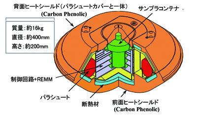 はやぶさは、小惑星「イトカワ」からサンプルを持ち帰るという当時としては非常に難易度の高いミッションに挑みました。そのサンプルを守るために作られたのが、この再突入カプセルです。